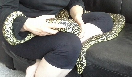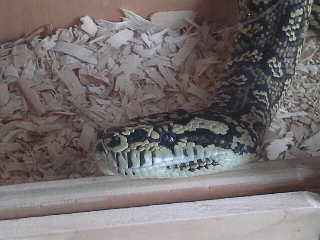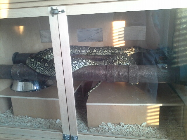 He's eating multipe f/t L rats that have been warmed, but he is used to eating from his branch so please consider your housing options with this in mind. Currently he has 3" covered pvc branch system that he spends quite a bit of time on sleeping and just hanging out, so he would make a good display snake if the room isn't too active.