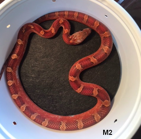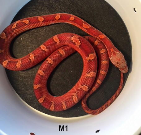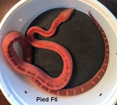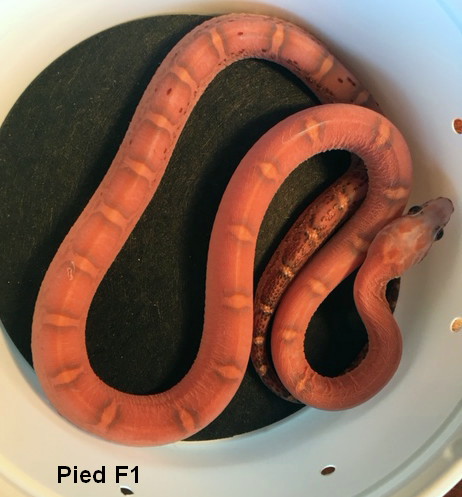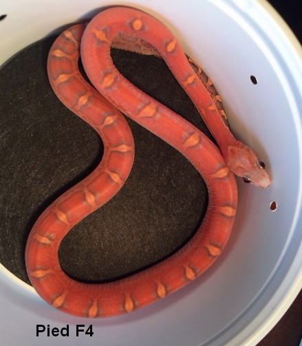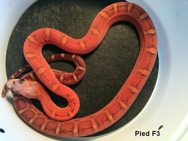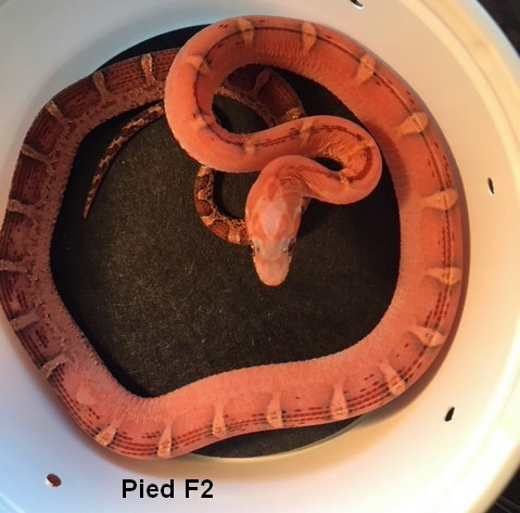 We did two separate breeding this past season (2017) involving bloodred pied scaleless corns. The first were a pair of visual scaleless bloodred pieds, and unbeknown to us both turned out to be het hypo. The second was the same visual male x a hypo bloodred pied, so all of the offspring from this pairing are either bloodred or hypo bloodred pieds het for scaleless. We've been growing them up and they're all thriving.