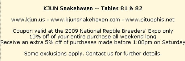 Get your free valuable coupon for the 2009 national Reptile Breeders' Expo in Daytona Beach, Florida just by printing out the below image...or visiting http://kjun.us/coupon.jpg. This coupon is only valid on new orders on the day of the show! Email us for more information, and we'll see you there.