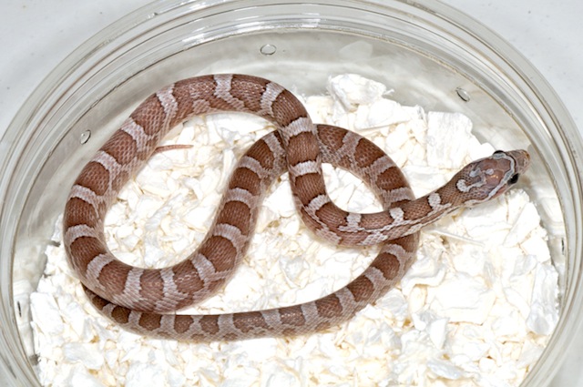 "She is a sibling to Striped Charcoal Terrazzos. She is not classically colored, but in so much as she has bloodredISH belly markings (you know - - - the blank space in the center of the belly from neck to tail), and since her grandfather was a pewter, she is probably het for bloodred?? No lavender has never been in this family. I think the odd coloration is the result of Key Corn HYPOish influence."